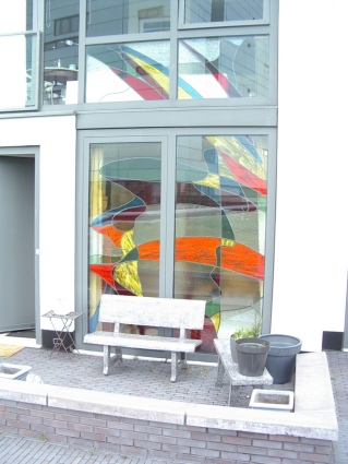 Voorpui woning. Glas in lood aan binnenzijde tegen het dubbelglas aangebracht.
